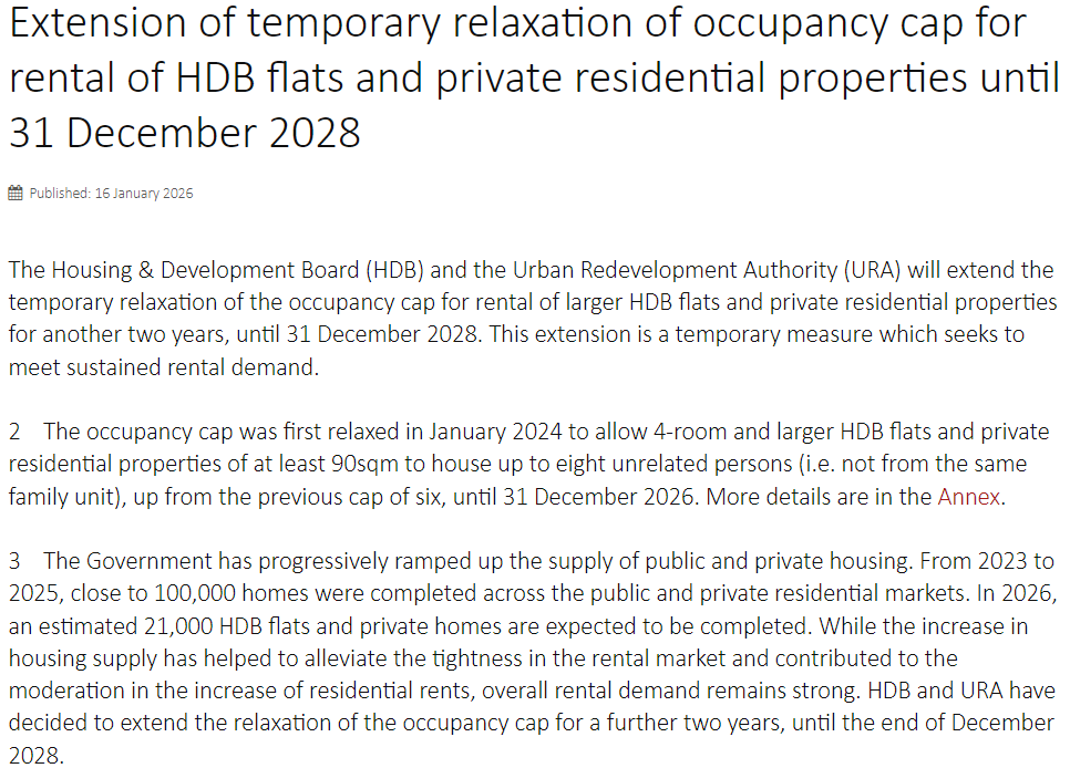 – The temporary relaxed rental occupancy cap that allows up to eight unrelated tenants in larger HDB flats and private residential properties has been extended to 31 December 2028. This policy expands housing flexibility for larger households, students, and workers needing shared accommodation, which in turn can ease rental pressure. (Source: URA Media Release)