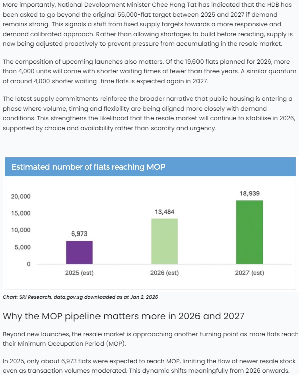 – A significant number of HDB flats (over 13,000 units) will reach their Minimum Occupation Period (MOP) in 2026, boosting resale supply and offering more choice to buyers. (Source: Edgeprop)