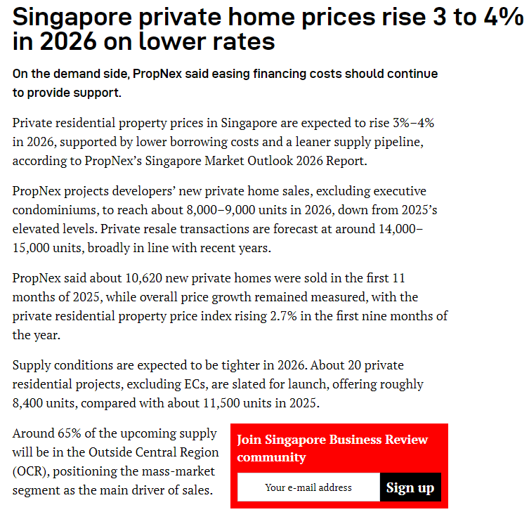 – Experts believe 2026 will see steady but modest price growth, supported by easing mortgage costs and sustained demand. (Source: Sbr.com.sg)