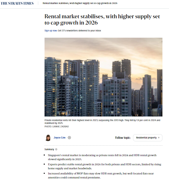 – Overall rental growth in 2026 is expected to be steady but measured, with rents stabilising rather than escalating. Analysts point out that rising supply — both new builds and MOP flats — will temper rental increases compared with the strong upward trend seen in earlier years. (Source: Straits Times – Rental Market Outlook)