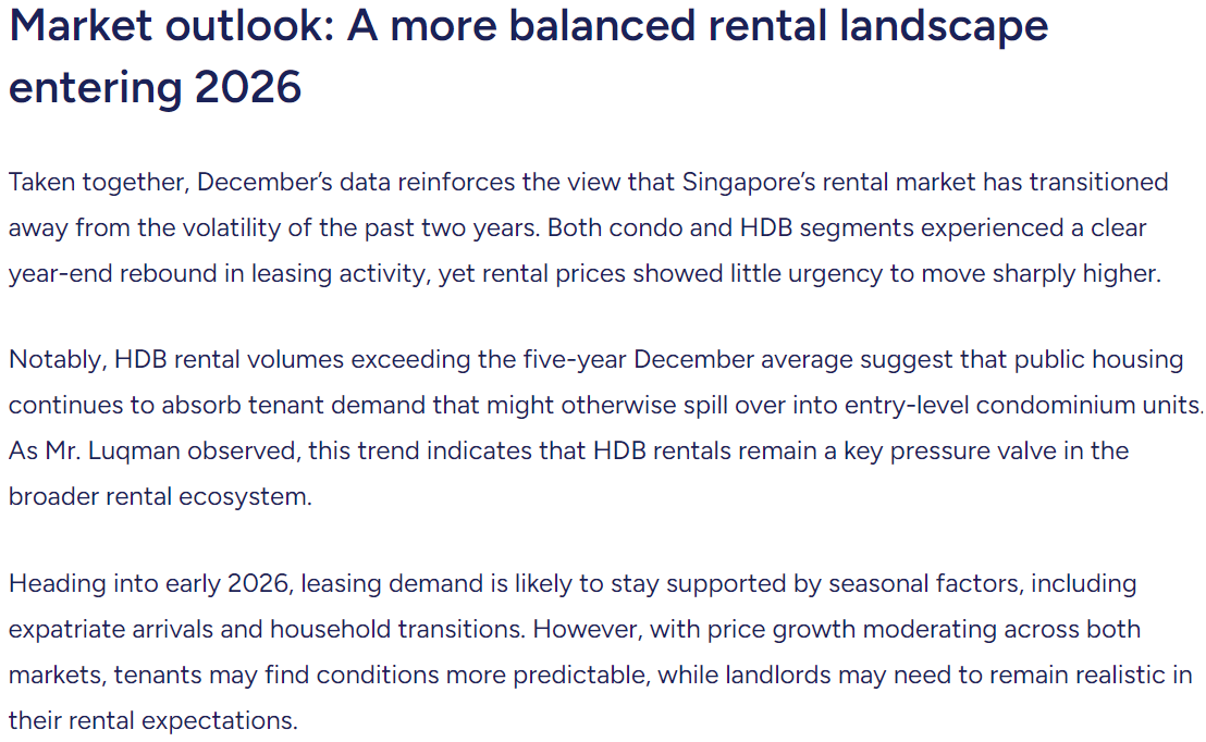 – Residential rents have broadly stabilised heading into 2026 after significant volatility in the past few years. Rental rates for both condos and HDB flats showed modest increases late in 2025, indicating that demand remains intact but growth is no longer as steep as during the post‑pandemic rebound. (Source: SRX / Condo & HDB Rental Data)