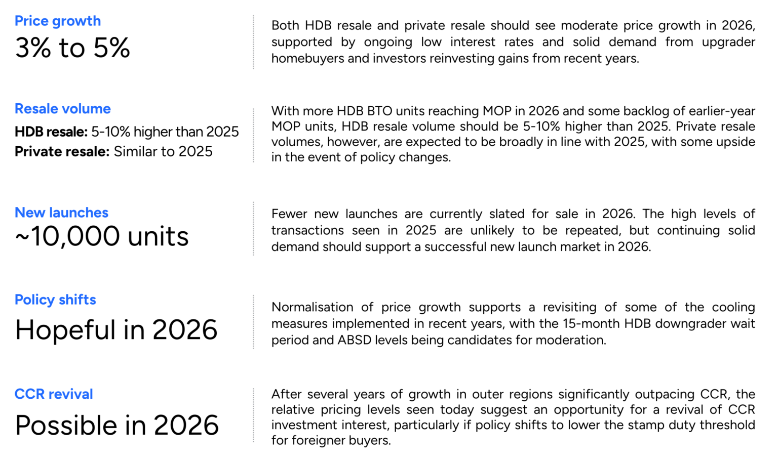 – Private homes: Projected to rise about 2.5%–4.5% in 2026, with some reports centering around ~3%. (Source: Sbr.com.sg)